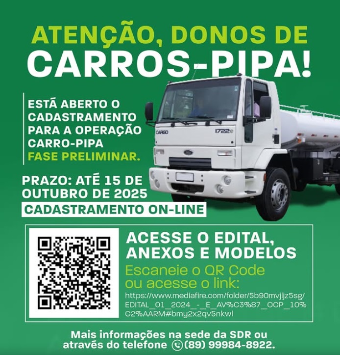 A Prefeitura Municipal de Pio Ix informa a todos que está aberto o cadastramento on-line para a Operação Carro-Pipa – Fase Preliminar.